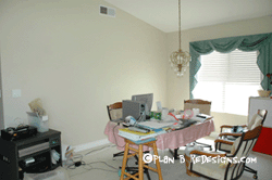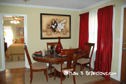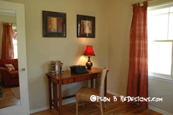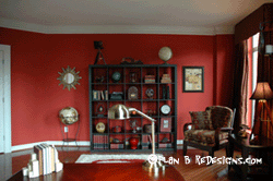 Custom draperies were about the only selling point to this room upon first viewing. Plan B selected a cool red hue for the walls and countered it with dark woods and contrasting fabrics. The result: a spacious office with three distinct areas of interest which included shelving for books and knick knacks, a set of chairs in a reading nook, and an executive desk for taking care of business.