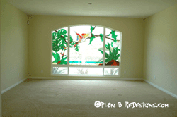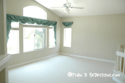 Plan B faces many challenges when it comes to staging properties. This home, however, takes first place for permanent visual distractions. The homeowner invested in this custom stained glass window but was not as eager to pay for its removal. Therefore Plan B was brought in to highlight the room and draw the eye elsewhere. The result: a layering of sheers and lined draperies disguise the window so that the buyers focused on the large interior space instead.