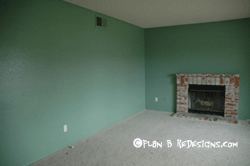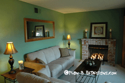 Sometimes homeowners are adamant about not painting an inch of their home for resale. In this case, Plan B had to work with the avocado green walls that greeted buyers in this living room. With soft lighting, neutral fabrics, and dark wooden accent pieces, Plan B aimed to create a universal living space. The result: a welcoming first impression that appealed to most buyers and drew the eye away from the old brick fireplace.