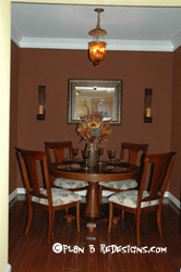 Small nooks in listings can be extremely difficult for home buyers to envision. This 9x9 room was listed on the floor plan as a library. However lining the walls with custom bookshelves and minimal lighting, would have left the space feeling even smaller and more cave-like. Plan B opted to paint the room a calming chocolate brown and add a pedestal round table for four. The result: a charming side room for private dinners away from the less formal great room.