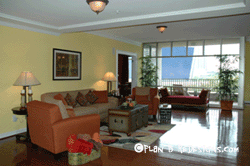 This is yet another angle of the first home on this page. In this view, the large window and cement patio create a cold and unwelcoming feel to the space. By balancing the window with tall silk plants instead of draperies (to showcase the view) and adding throw rugs to absorb the echo, Plan B was able to focus the buyer's attention on the locale of the listing. The result: an entertainment space with magnificent views of the city skyline across from Centennial Olympic Park.